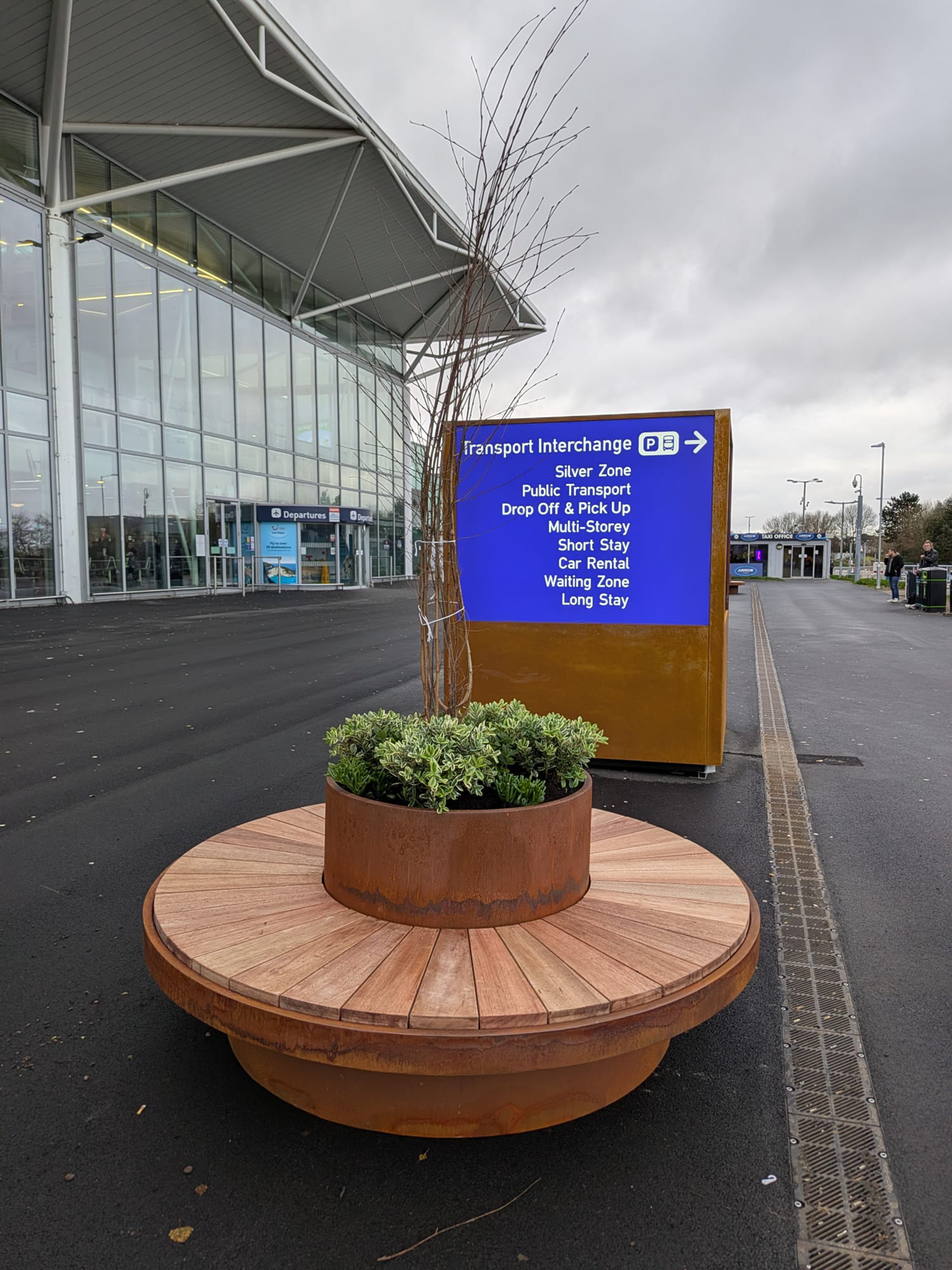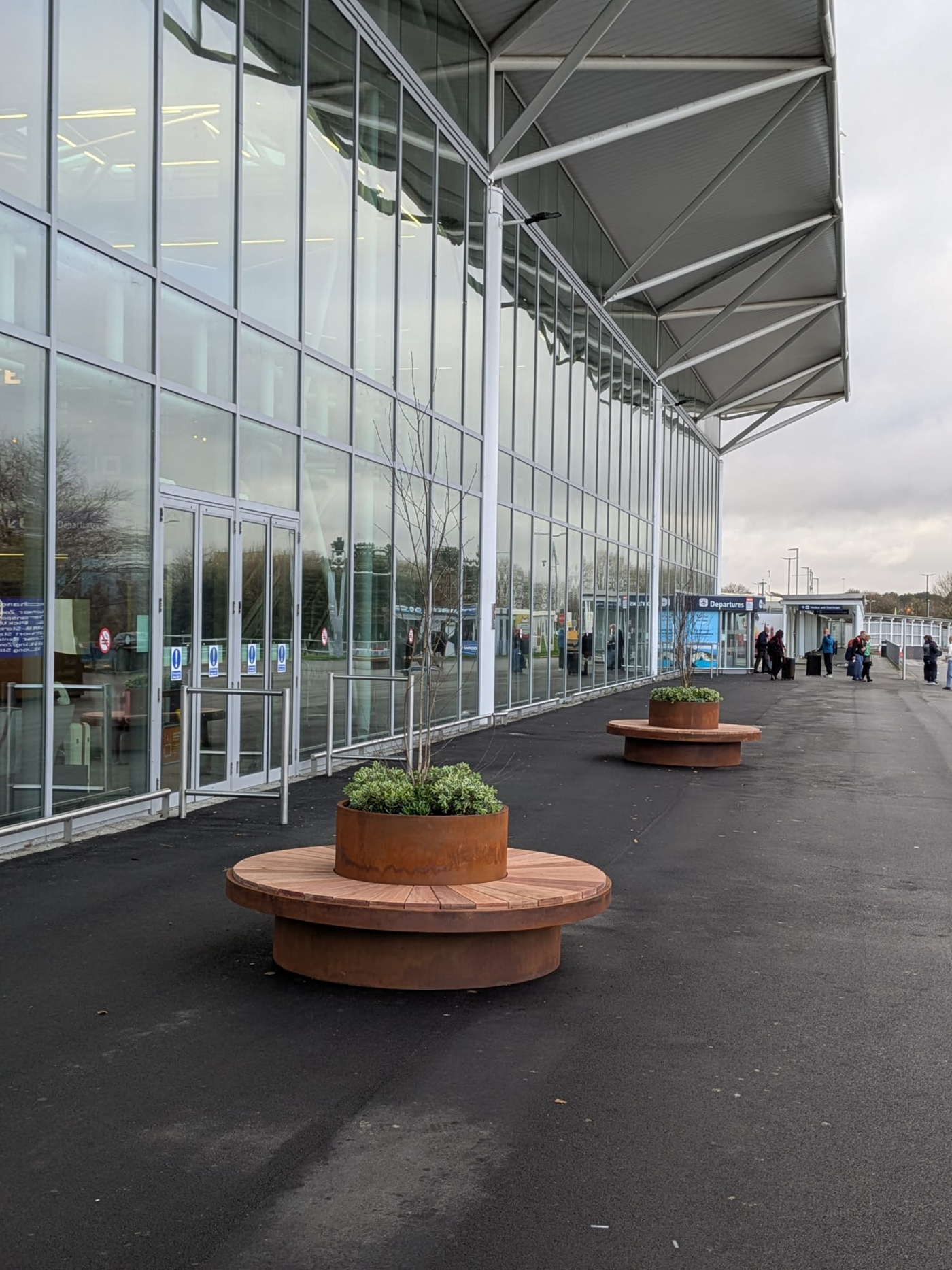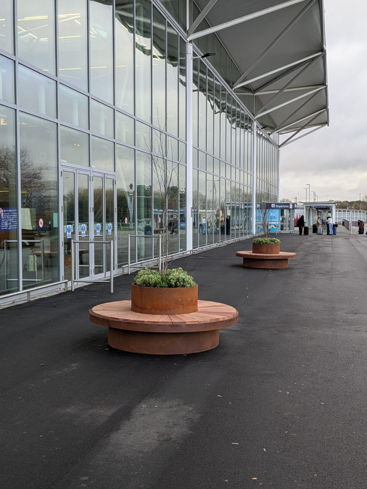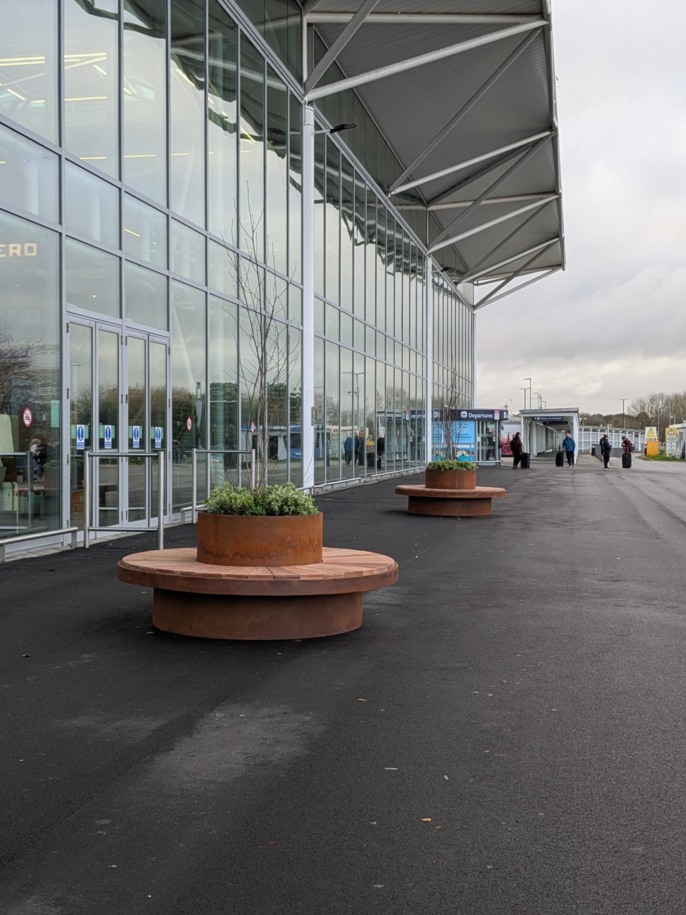 The completed installation delivers a striking visual statement that elevates the airport’s outdoor seating areas. The furniture provides the character and depth of corten steel, paired with the performance benefits of fibreglass — a practical, durable solution ideally suited to a demanding public environment.