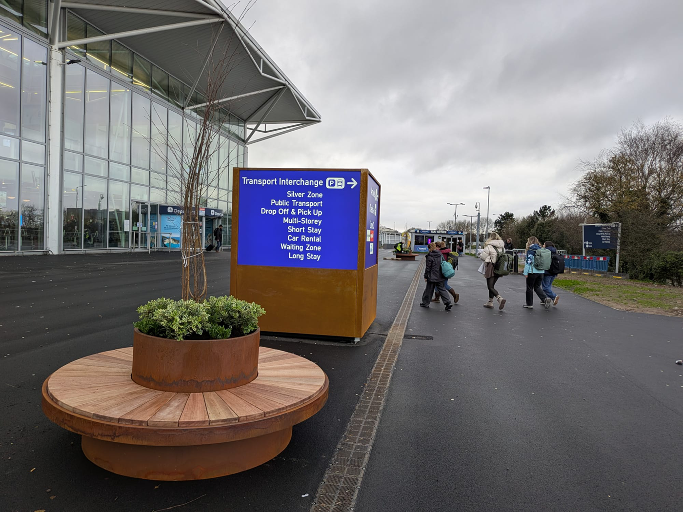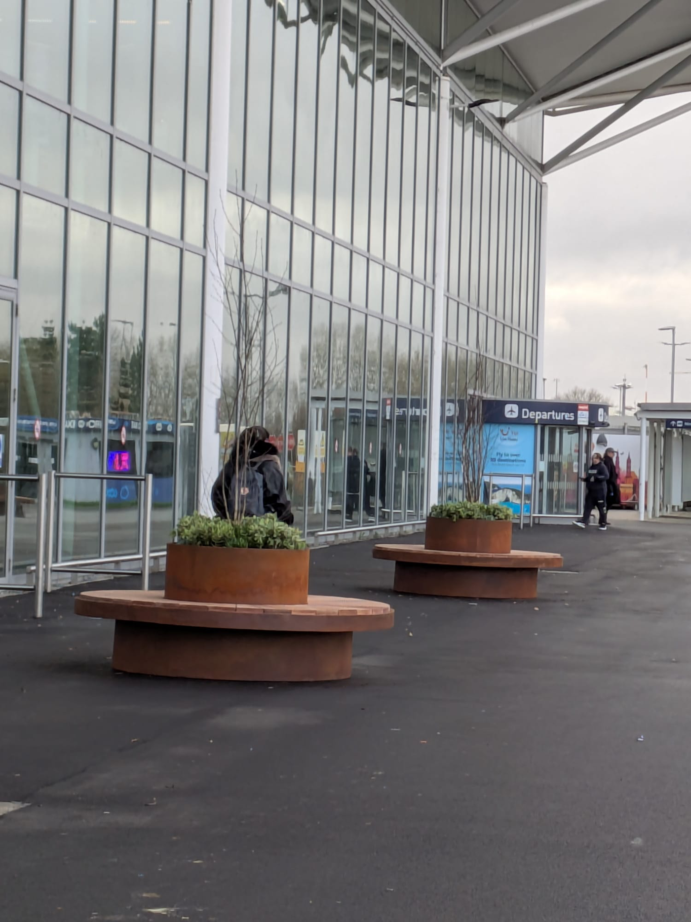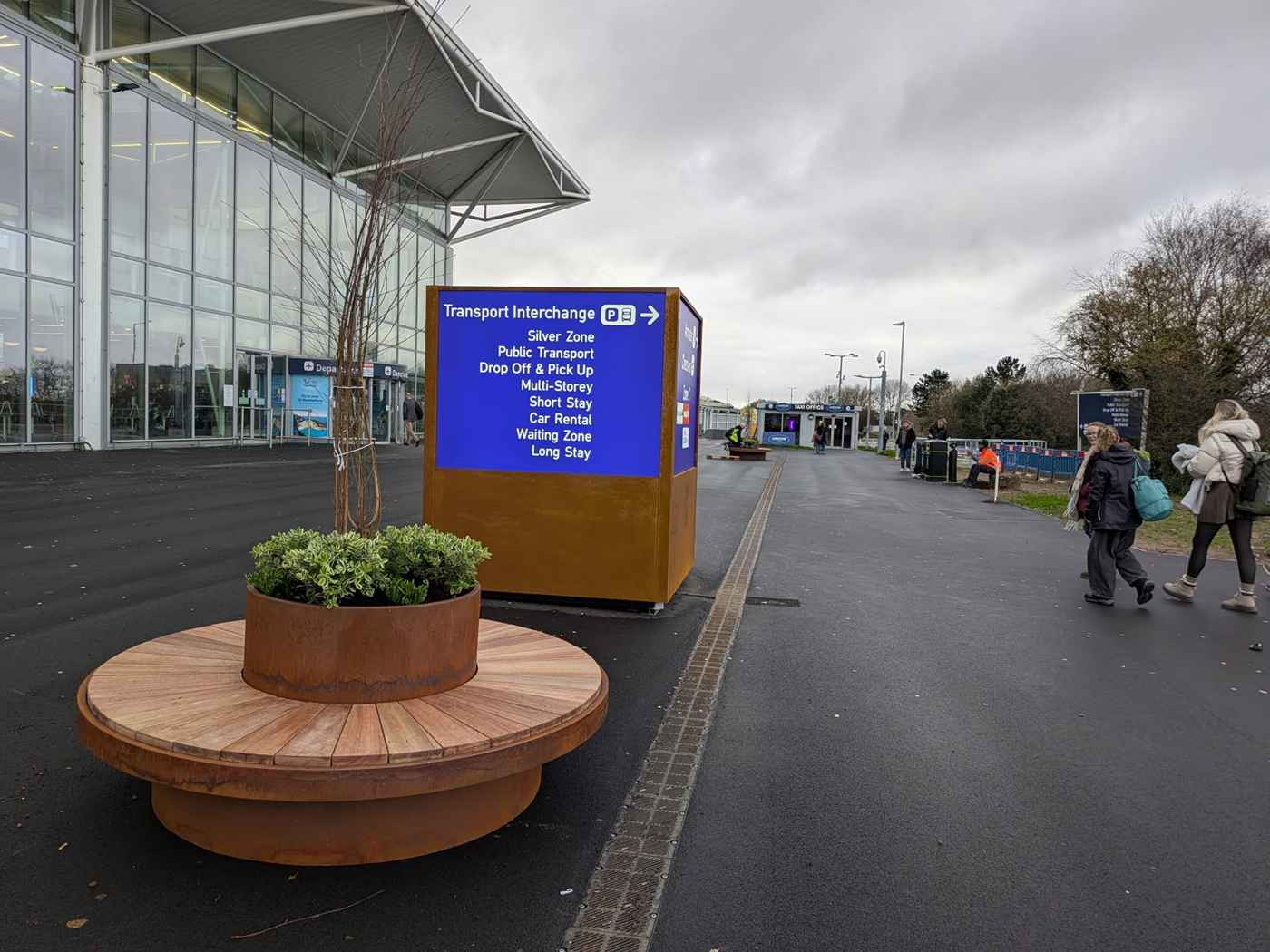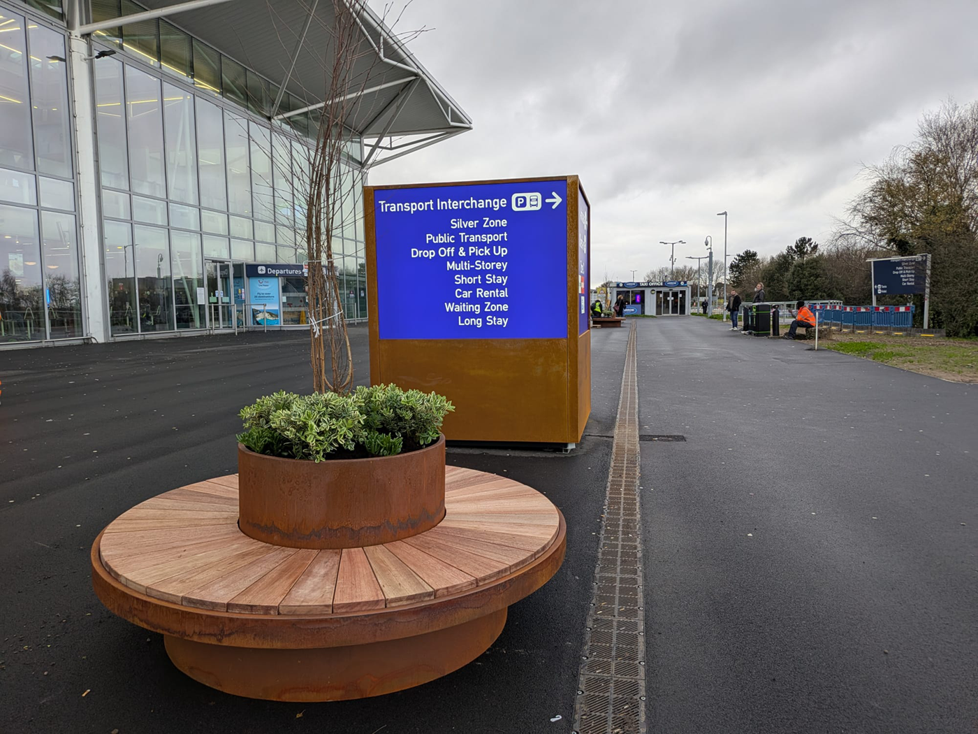 The completed installation delivers a striking visual statement that elevates the airport’s outdoor seating areas. The furniture provides the character and depth of corten steel, paired with the performance benefits of fibreglass — a practical, durable solution ideally suited to a demanding public environment.